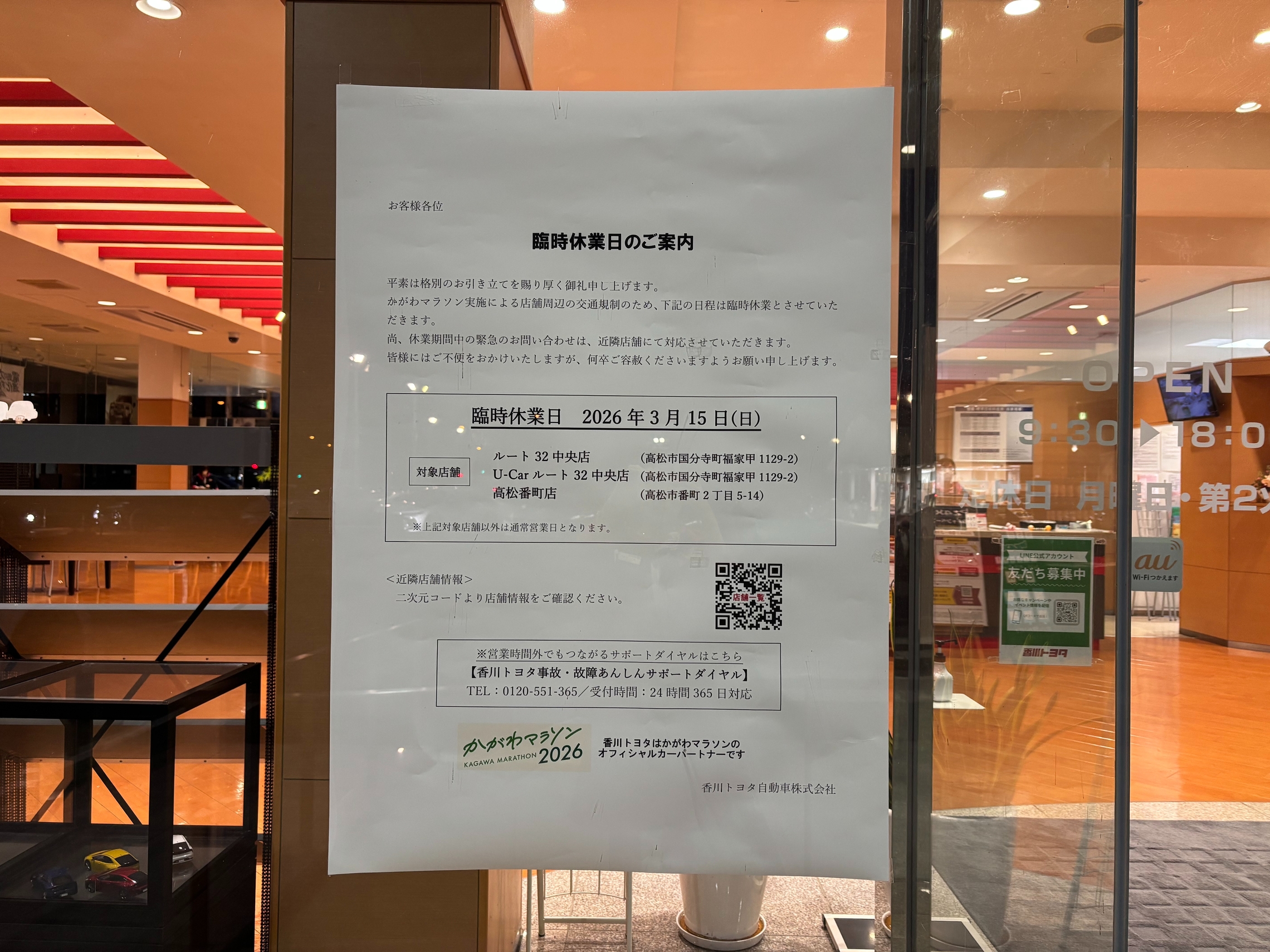 かがわマラソン実施による店舗周辺の交通規制のため、