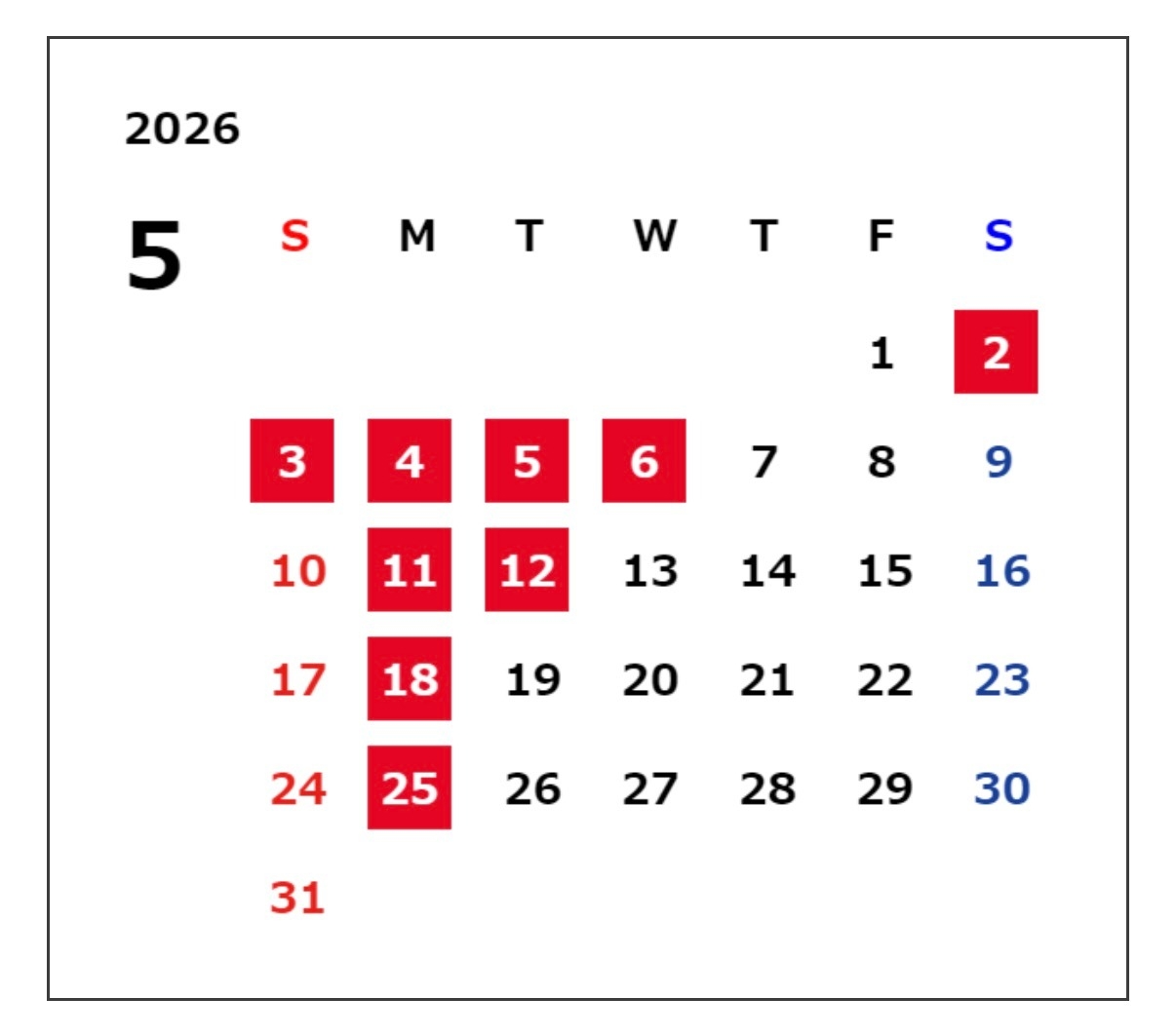 5/2(日)~5/6(水)まで全店舗休業となります。