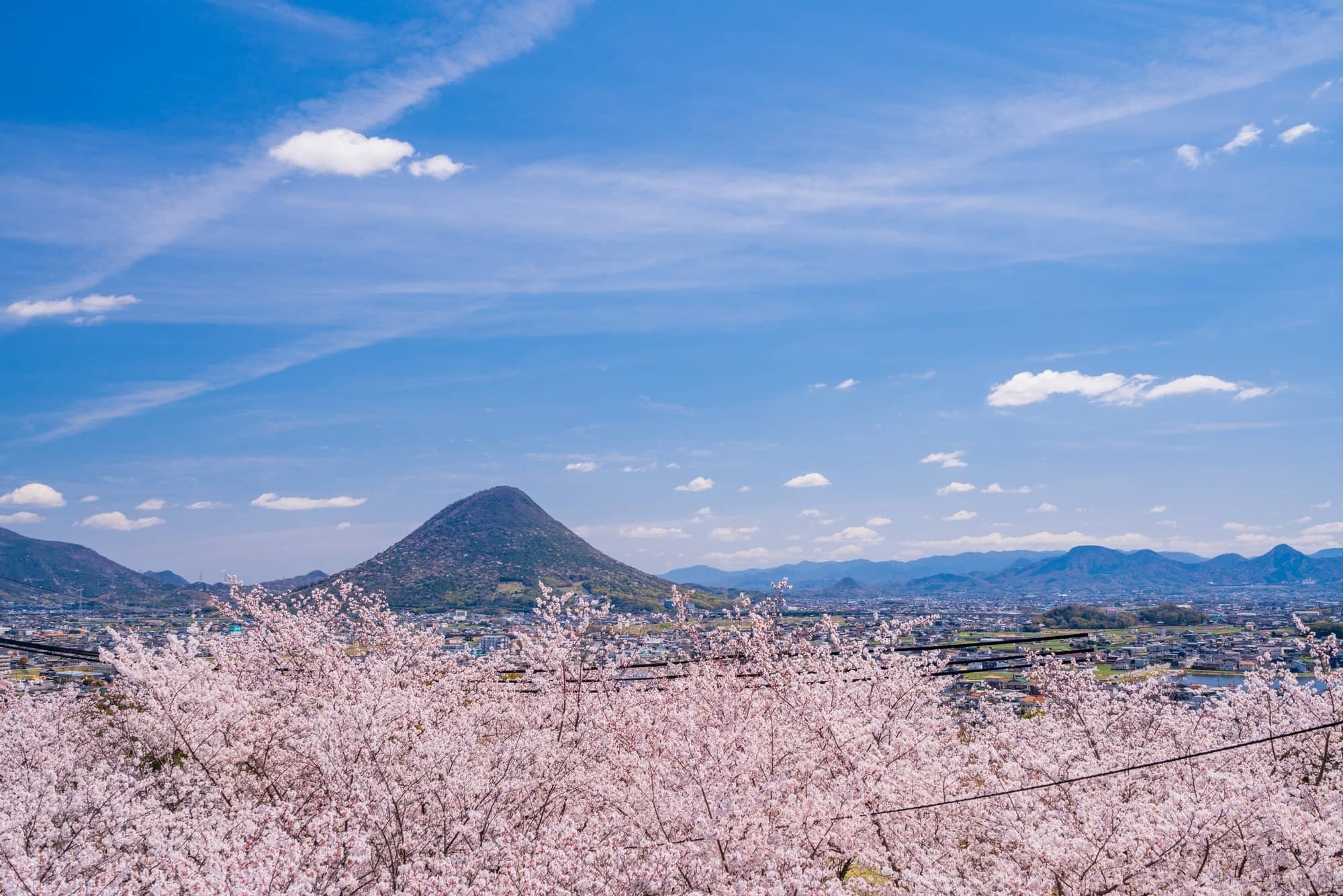 町のシンボルである讃岐富士、北に瀬戸内海や瀬戸大橋が一望できます
