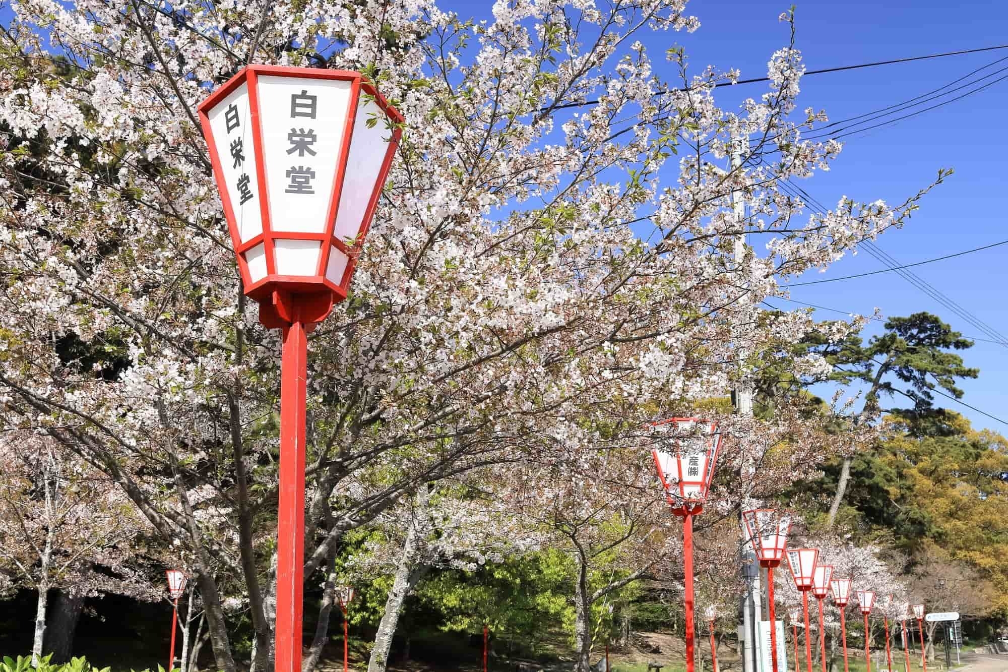 春になると石灯籠の両脇に並ぶ約130本のソメイヨシノが
